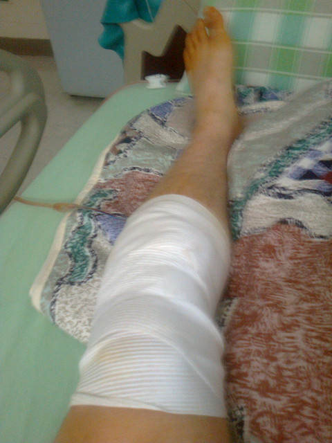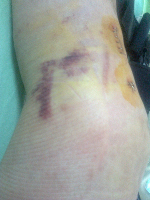 | 術後的腿到處都是瘀青,不過醫生說這是正常現象 |